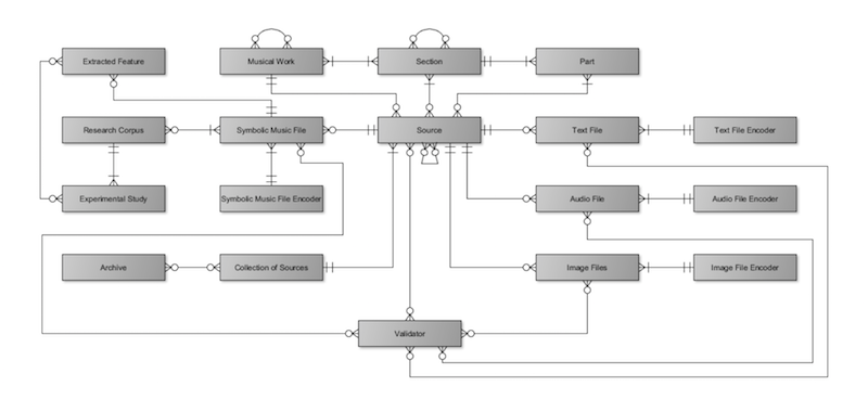 Cory McKay introduced SIMSSA DB: A Database for Computational Musicological Research. This database is for storing and organizing symbolic music files and research studies, dealing with the best ways of handling metadata for a wide range of musical materials. His presentation gave an overview of the considerations that went into the new data model as well as the progress we’ve made this summer. Here is the entity-relationship diagram for the database: