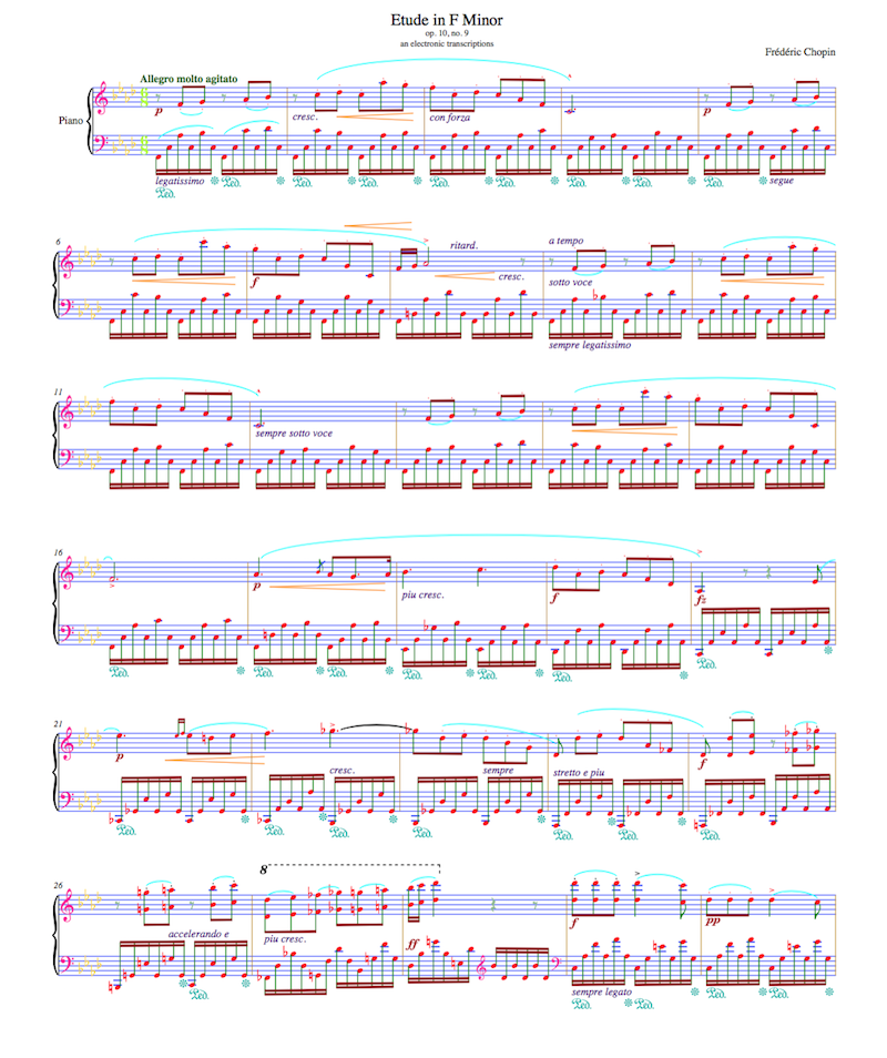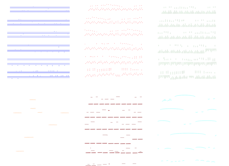 Next, Laurent Pugin gave us an update on the latest developments in Verovio, including harmonic annotations, better handling of trill extensions and text that extends across multiple barlines, and PDF score output. You can see his slides here. He also showed a neat example of how you can separate the layers of different kinds of symbols. Here they are highlighted: